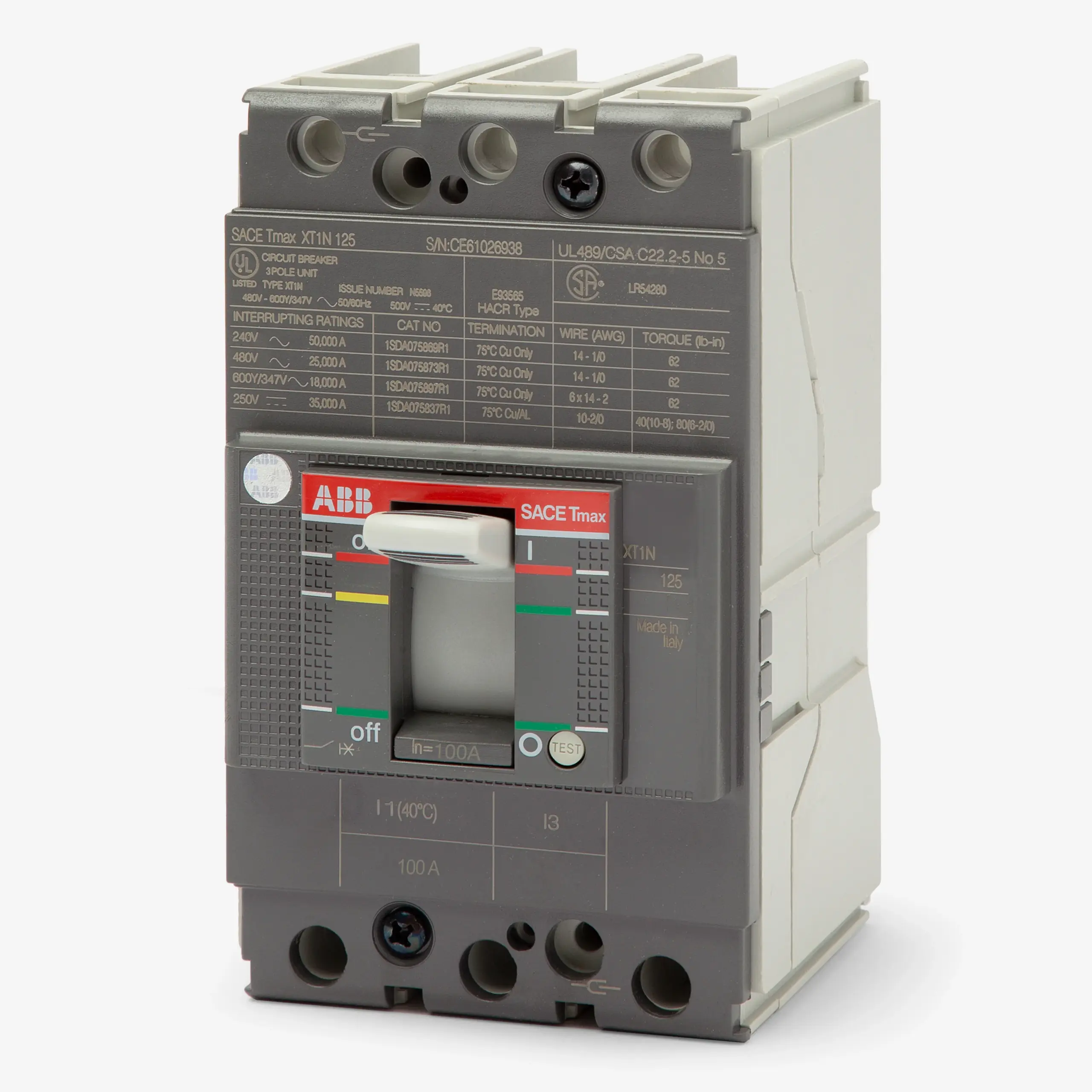 XT1NU3100AFF000XXX ABB Tmax Breaker Frame Size XT1N 125 Thermal Magnetic Fixed 100-500 Three-Pole Fixed + Front Flat Terminals Underwriters Laboratory/Canadian Standards Association